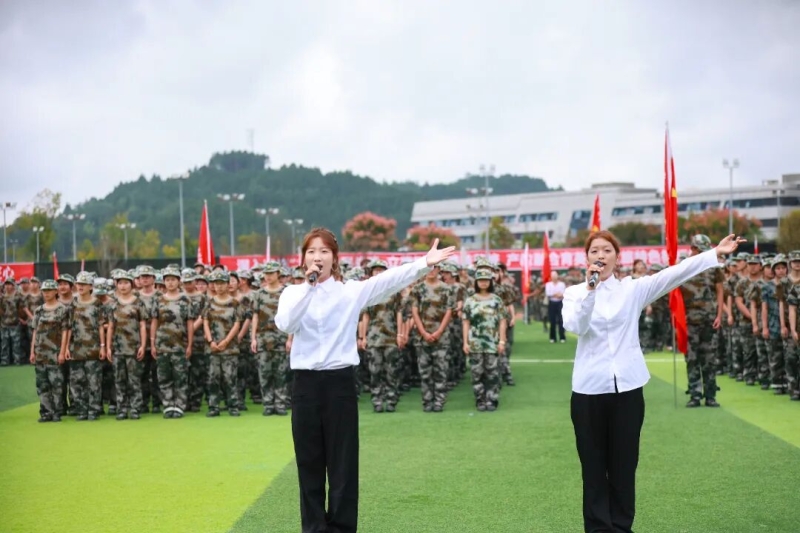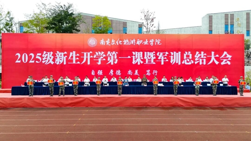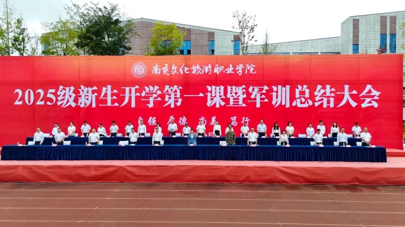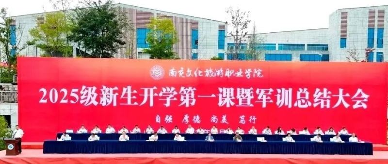 9月30日上午,南充文化旅游职业学院2025级新生开学第一课暨军训总结大会在西运动场召开。